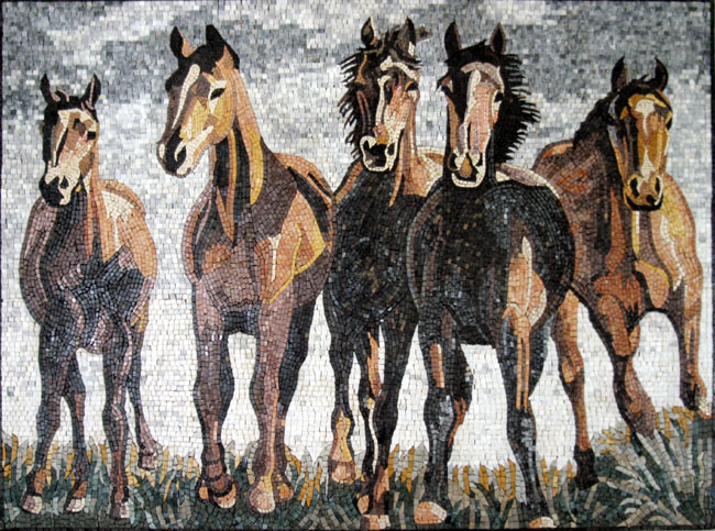 AN183 Rectangular galloping horses mosaic AN282 Black horse in motion mosaic AN620 Two white fighting horses mosaic AN316 Majestic white jumping horse mosaic AN218 Linear pastel horse mosaic |