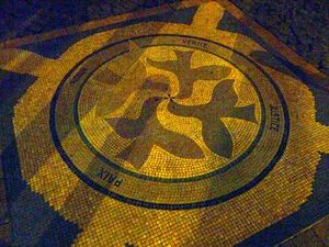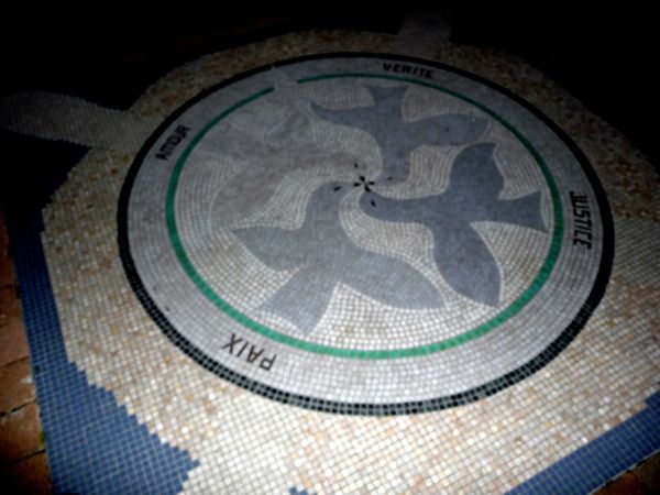 En sortant de la salle de spectacle à l’entrepôt au Haillan bien entendu il faisait sombre, mais j’ai voulu prendre une photo de la mosaïque que j’avais repéré avant d’entrer en passant sur le parvis de l’église…. on dit toujours que pour les mosaïques il ne faut pas de flash seulement malgré l’éclairage public ma photo est toute noire! par la magie du correcteur photographique la voilà en jaune