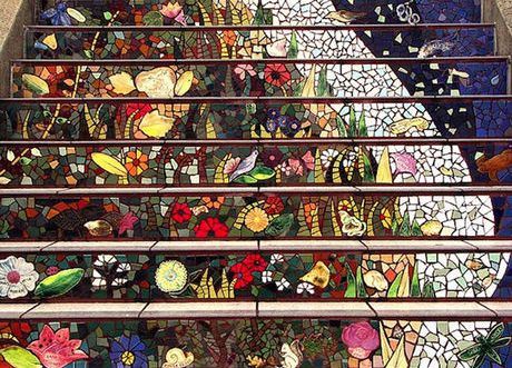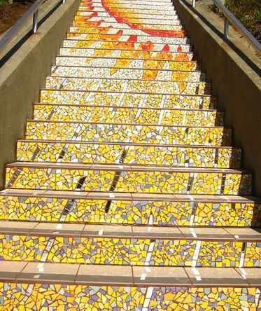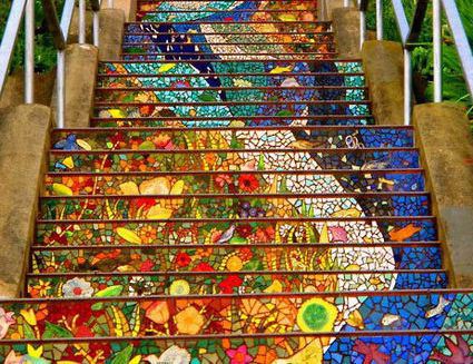 Mais a l arrivee, la recompense est pour les plus courageux…..Une magnifique vue sur la ville. La ceramiste Aileen Barr et la mosaiste Colette Crutcher ont entraine avec elles quelques 300 benevoles qui ont participe ensemble pour redonner vie a un viel escalier datant de 1926.