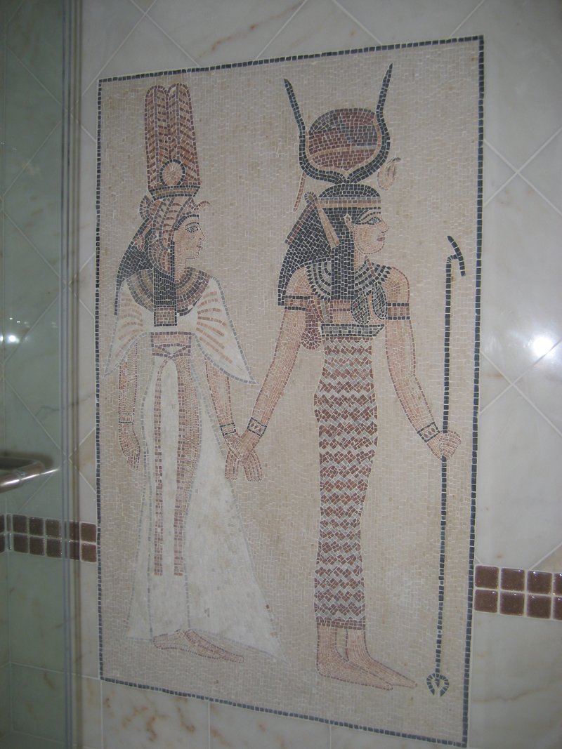 This beautiful Egyptian mosaic installation adorns one of our bathroom projects. Simple and elegant, it brings back the Pharaon days through a nice work of mosaic tiles and strikes as unique and authentic.