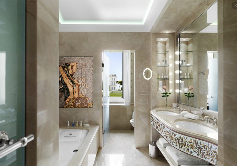 This beautiful golden abstract mosaic artwork adds a touch of sparkle and magic to the bathroom. Coupled with an elegant work of mosaic tiles covering the toilet counter, the aesthetic result is simply unmatchable! Choose this luxurious look for your bathroom from our unique selection of mosaic installations. |