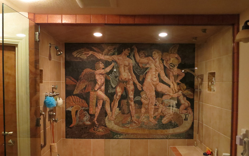 A majestic piece of art to have in your shower space! This nude gathering mosaic mural covers the shower wall and sets an enigmatic and inevitable artistic touch that radically changes the mood and look of your bathroom!