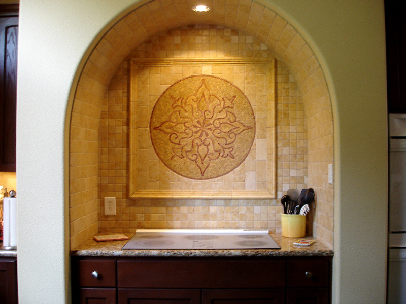 Create nice corners in your kitchen like this beautiful arch structure over the hood adorned with mosaic art. Embellish and enhance your kitchen appliances and space with a touch of art like this elegant square mosaic backsplash that adds life and style to the hood space. |