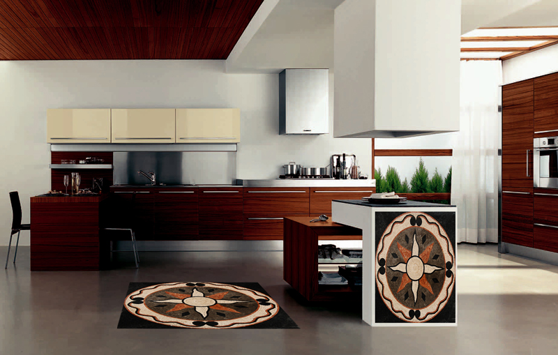 Who wouldn’t dream of having a kitchen like this in his own house? The elegant marriage of wood material and white color gives unique beauty and style to this kitchen space, while the mosaic installations come to highlight even more the welcoming open modern space, adding artistic colors and movement with elegant and assorted counter side and floor mosaic artworks. |