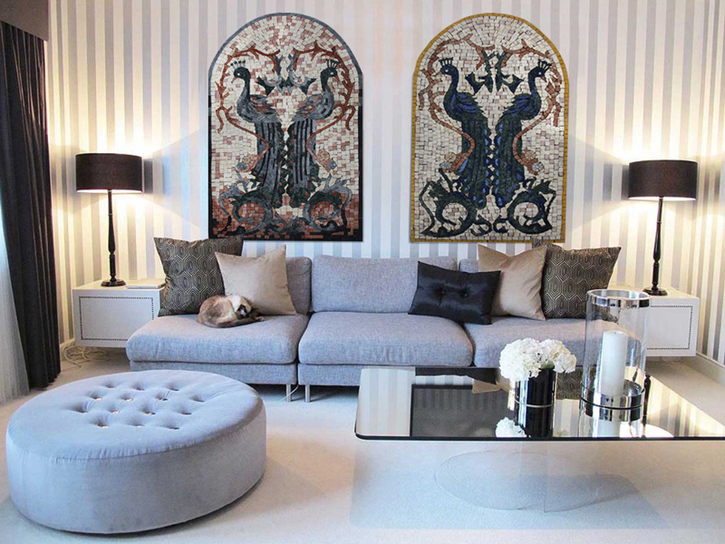 Choose to hang mosaic-tile paintings in your living room for a unique touch of art. These beautiful mosaic arched peacock murals equilibrate the mood of the room by adding a sophisticated artistic touch to the simple and modern style of its furniture, bringing the space to life. |