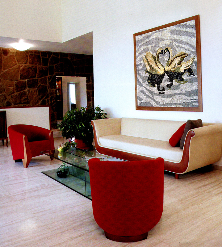 Decorating your living spaces with mosaic paintings brings uniqueness and elegance to your interiors. This beautiful swans’ mosaic mural lies gracefully on the wall, completing the room’s design with its assorted colors and delicate touch of art.
