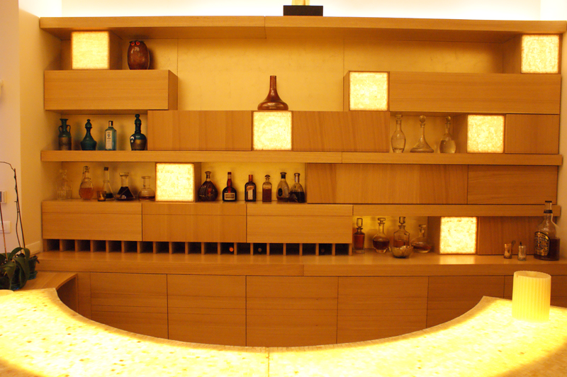 Adding a translucent option to your marble tiles increases the magic. The effect of the countertop’s light in this picture, emphasized by the translucent mosaic squares inserted in the wooden installation behind the bar, creates a uniquely warm and attractive ambience. |