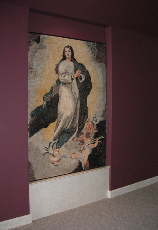 This mosaic overwhelms the plain purple wall of a church, with a spiritual depiction of the Virgin Mary rising on clouds, angels at Her feet. Beautiful and gracious, the divine Mary embellishes the church and enriches it with elegance and meaning.