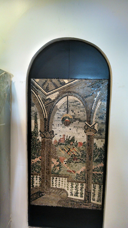 This “trompe-l’oeil” mosaic mural is like a window that opens to a beautiful landscape. Its vibrant colors and practical size make it convenient for any wall.