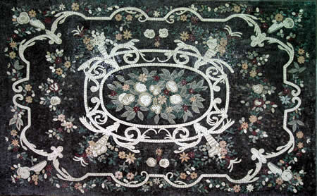 CR238 Elegant black gold & white floral mosaic CR242 Beautiful light blue floral marble mosaic CR403 Beautiful pink rose bouquet mosaic CR3 Artistic floral design mosaic on black background |