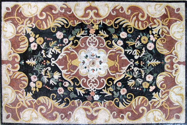 CR238 Elegant black gold & white floral mosaic CR242 Beautiful light blue floral marble mosaic CR403 Beautiful pink rose bouquet mosaic CR3 Artistic floral design mosaic on black background |