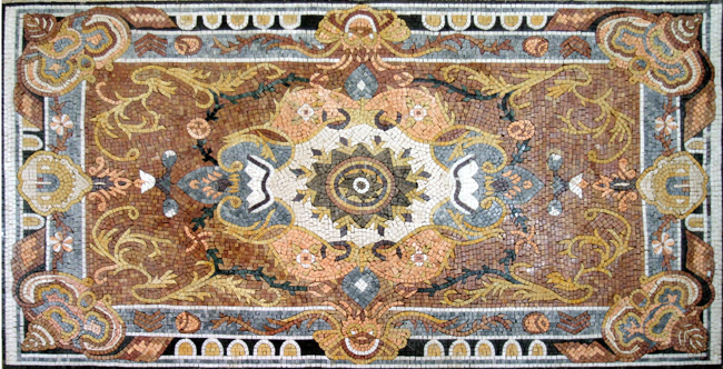 CR188 Earthtone artisanal design mosaic CR196 Rectangfular floral design mosaic with border CR155 Classic square rug design mosaic CR24 Red tulip patterns on yellow marble tiles |