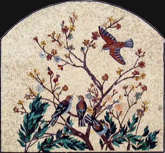 AN308 Oval colorful birds and flower branches on white background mosaic