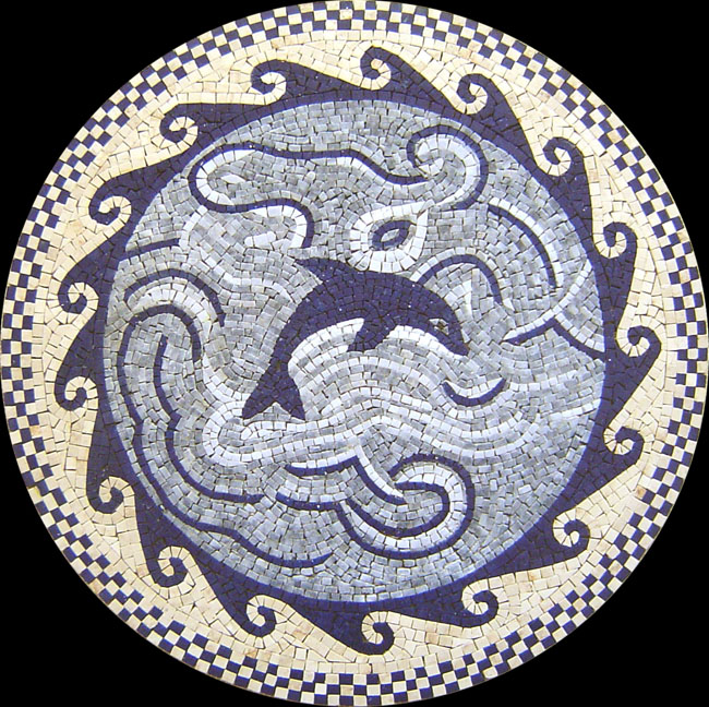 MD576 dolphins swimming in circle with wave border mosaic MD155 swimming dolphins mosaic with wave border MD278 swimming dolphins mosaic with wave border MD484 two dolphins playing with red ball medallion MD843 dolphins swimming in circle on turquoise background |